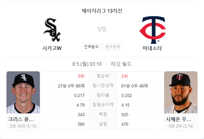 미네소타의 타선은 이번 시즌 경기당 평균 4.86점을 기록하며 리그 7위를 차지하고 있습니다. 타율, 출루율, 장타율 모두 상위권에 있으며, 홈런도 리그 9위를 기록 중입니다. 트윈스는 시카고를 상대로 한 홈 경기에서 매번 6점 이상을 득점하는 강력한 모습을 보였습니다.