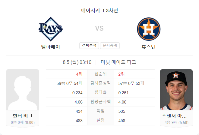 탬파베이 레이스는 주요 선수들을 트레이드하며 전력이 약화되었고, 최근 타선의 부진이 이어지고 있습니다. 반면, 휴스턴 애스트로스는 스펜서 아리게티의 안정적인 투구와 강력한 타선을 바탕으로 승리할 가능성이 높습니다. 특히 레이스의 불펜이 다소 약해진 상황에서 애스트로스의 타선이 큰 역할을 할 것으로 예상됩니다. 따라서 이번 경기는 휴스턴 애스트로스가 승리할 것으로 보입니다.