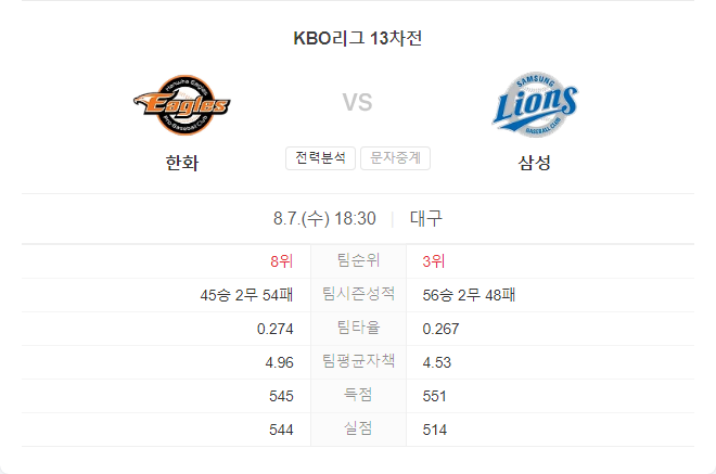 두 팀 모두 최근 좋은 타격감을 보이며 상승세를 타고 있어 치열한 경기가 예상됩니다. 한화의 강력한 타선이 삼성의 마운드를 공략하며 승리를 가져갈 가능성이 높습니다.