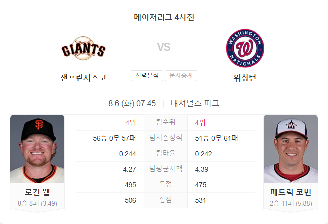 샌프란시스코 자이언츠는 최근 상승세를 타고 있으며, 공격과 수비에서 안정적인 모습을 보이고 있다. 로건 웹의 안정적인 피칭과 강력한 타선의 힘을 바탕으로 이번 경기에서도 우세한 위치에 있다. 반면, 워싱턴 내셔널스는 패트릭 코빈의 부진과 불안정한 투수진으로 인해 어려움을 겪고 있다. 자이언츠는 최근 경기에서 보여준 강력한 모습을 바탕으로 이번 경기에서도 승리를 거둘 가능성이 높다.