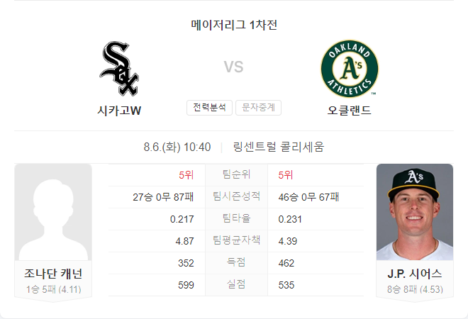 이번 경기는 시카고 화이트삭스와 오클랜드 어슬레틱스 간의 대결로, 양 팀 모두 시즌 성적이 좋지 않은 상황이다. 그러나 최근 오클랜드 어슬레틱스는 비교적 안정적인 성적을 내고 있으며, 특히 선발 투수 JP 시어스가 좋은 피칭을 보여주고 있다. 반면, 시카고 화이트삭스는 공격력과 불펜 모두에서 부진한 모습을 보이고 있어, 오클랜드 어슬레틱스가 우세할 것으로 보인다.