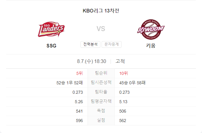 8월 7일 KBO 프로야구 SSG 랜더스 VS 키움 히어로즈 타카짱의 경기 예측 분석