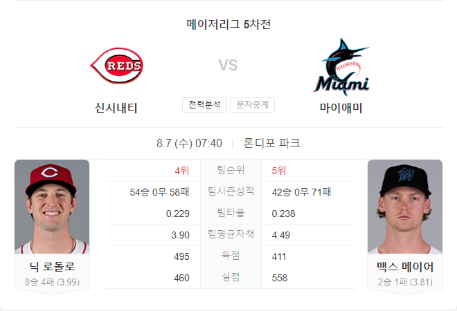 이번 경기는 마이애미가 홈에서 승리를 거두기 좋은 기회로 보인다. 맥스 메이어는 올 시즌 안정적인 투구를 보여주고 있으며, 신시내티의 공격을 억제할 가능성이 있다. 반면, 신시내티의 닉 로돌로는 최근 부진한 모습을 보이고 있다. 마이애미가 홈에서 승리를 거둘 가능성이 높다.