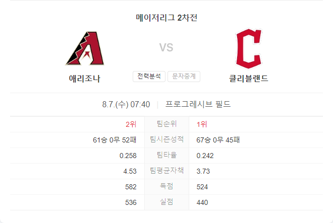 애리조나 다이아몬드백스는 현재 60승 52패로 와일드 카드 자리를 지키고 있다. 에두아르도 로드리게스가 이번 시즌 첫 선발 등판을 하게 된다. 그는 2023년에 3.30 ERA와 1.15 WHIP을 기록하며 최고의 시즌을 보냈으며, 클리블랜드를 상대로 55.1 이닝 동안 2.28 ERA와 6승 0패를 기록한 바 있다. 최근 다이아몬드백스는 5개의 시리즈를 연속으로 승리하며 상승세를 타고 있으며, 이번 시리즈에서도 좋은 성적을 기대하고 있다.