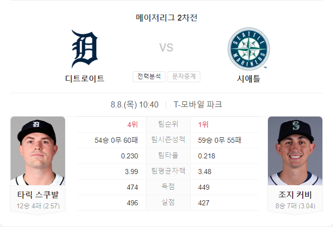 이번 경기는 투수전이 될 가능성이 큽니다. 디트로이트 타이거즈는 최근 우완 투수들을 상대로 타격 부진을 겪고 있으며, 시애틀 매리너스의 조지 커비가 이를 잘 막아낼 것으로 보입니다. 반면, 매리너스는 좌완 투수 타릭 스쿠발을 상대로도 좋은 성적을 기록하고 있습니다. 따라서 시애틀 매리너스가 승리할 가능성이 높습니다.