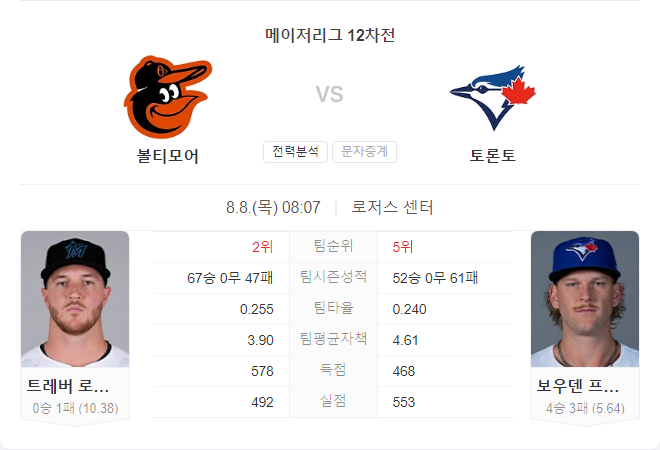볼티모어 오리올스는 이번 시즌 67승 46패로 좋은 성적을 기록하고 있으며, 아메리칸 리그 동부지구 선두를 달리고 있습니다. 팀의 주요 선수로는 유격수 군나 헨더슨, 포수 애들리 러치맨, 우익수 앤서니 산탄데르가 있습니다. 오리올스는 팀 출루율(OBP) 10위, 팀 OPS 1위를 기록하며 강력한 공격력을 자랑하고 있습니다. 투수진도 평균자책점(ERA) 3.89로 리그 11위에 올라 안정적인 피칭을 보여주고 있습니다. 이번 경기에서는 좌완 투수 트레버 로저스가 선발로 나서며, 그는 이번 시즌 22경기에서 4.76 ERA와 1.55 WHIP를 기록하고 있습니다.