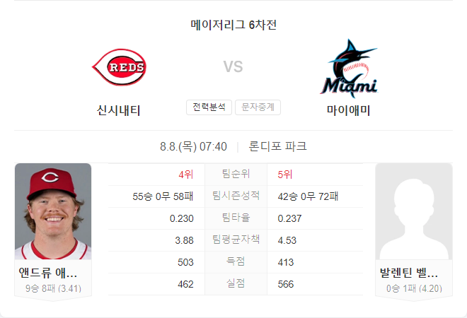이번 경기는 신시내티 레즈가 우세할 것으로 보입니다. 레즈는 최근 안정적인 투수진과 공격력을 바탕으로 좋은 성적을 이어가고 있으며, 앤드류 애봇의 안정적인 피칭이 기대됩니다. 반면, 마이애미 말린스는 공격력에서 큰 어려움을 겪고 있으며, 발렌테 벨로조의 경험 부족이 변수로 작용할 수 있습니다. 전체적으로 레즈가 경기를 주도할 가능성이 높으며, 경기 총점은 OVER 7.5점을 예상합니다.