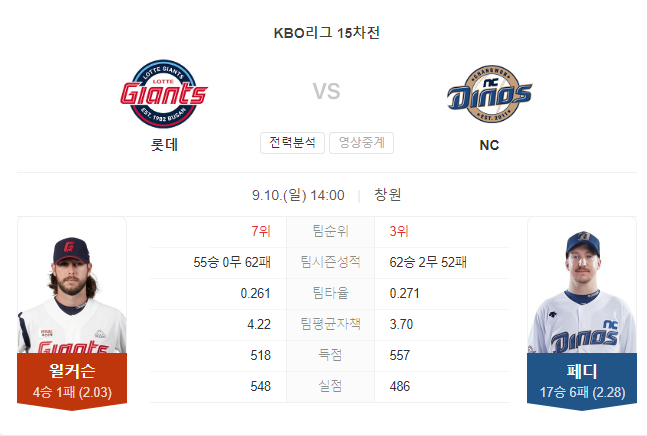 9월 10일 프로야구 KBO 롯데 VS NC 경기 프리뷰