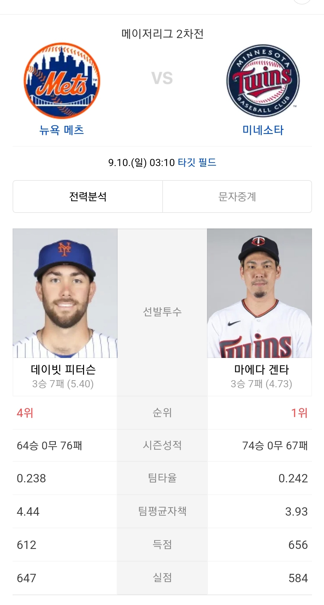 양 팀의 대결에서 전력 차이가 드러나고 있으며, 미네소타 트윈스가 승리에 가까이 있는 상황입니다. 마에다와 피터슨의 투수 대결은 주목받겠지만, 타격과 불펜의 차이가 경기 결과에 영향을 미칠 것으로 보입니다.