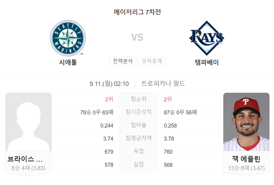 9월 11일 메이저리그 MLB 시애틀 VS 탬파베이 경기 프리뷰