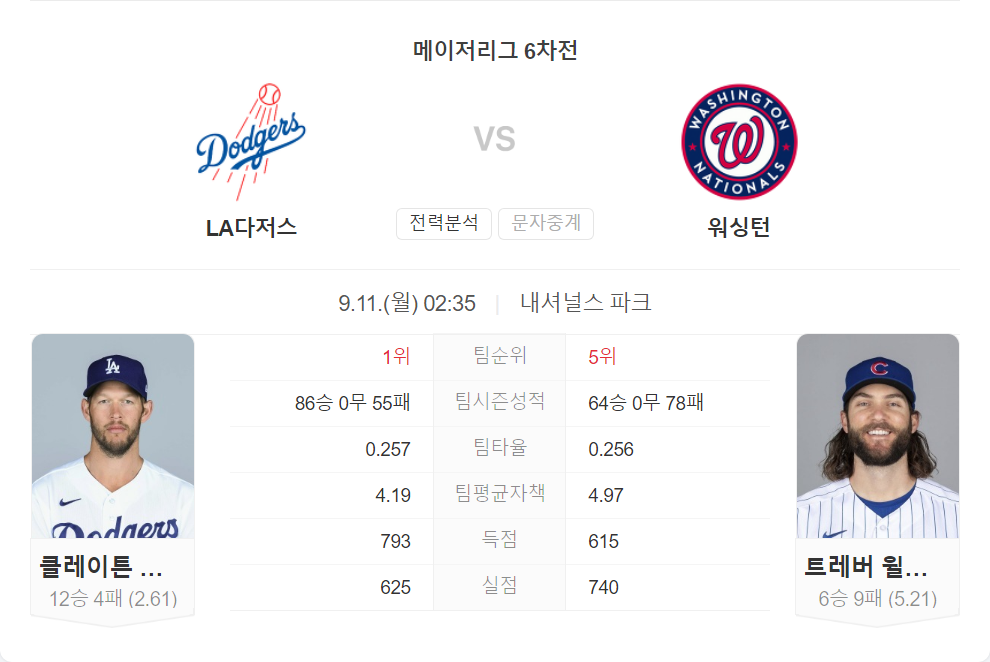 9월 11일 메이저리그 MLB LA 다저스 VS 워싱턴 경기 프리뷰