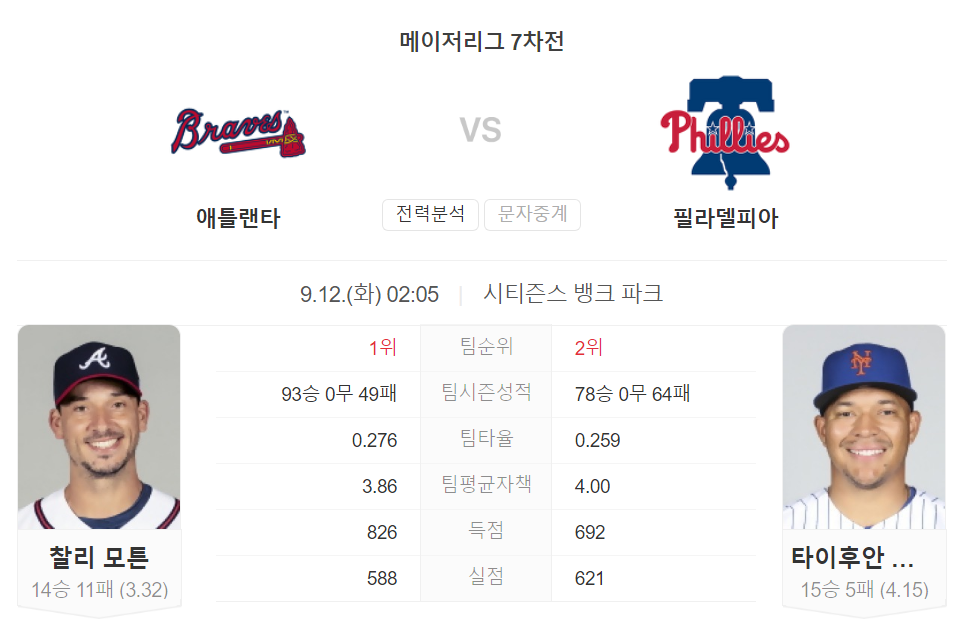 9월 12일 메이저리그 MLB 애틀랜타 VS 필라델피아 경기 프리뷰
