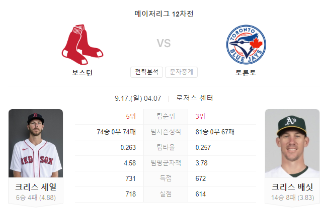 반면, 보스턴 레드삭스는 크리스 세일을 선발로 나타냅니다. 그러나 세일은 최근 부상과 복귀 이후 안정감을 찾지 못하고 있습니다. 뛰어난 삼진 능력을 갖고 있지만, 포심의 피장타율이 높아 공을 많이 몰리게 되고 있습니다. 그리고 세일의 구속력은 92마일 정도로 떨어져 있어 상대 타선을 힘으로 제압하기 어렵습니다.