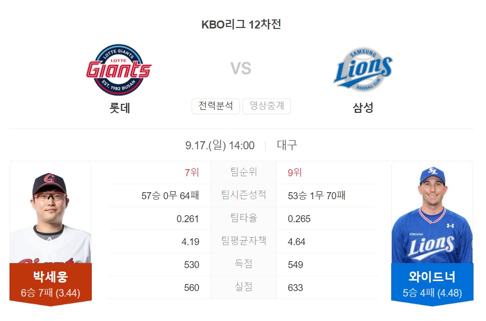 롯데는 우천 취소가 아쉬운 상황에서 박세웅(6승 7패 3.44)이 시즌 7승을 노리며 나섭니다. 박세웅은 최근 NC 원정에서 6.2이닝 동안 2실점을 허용하며 호투의 모습을 되찾고 있는 중입니다. 금년 삼성 상대로 원정에서 6.2이닝 2실점으로 호투한 경기를 고려하면, 이번 경기에서도 호투의 가능성이 높습니다.