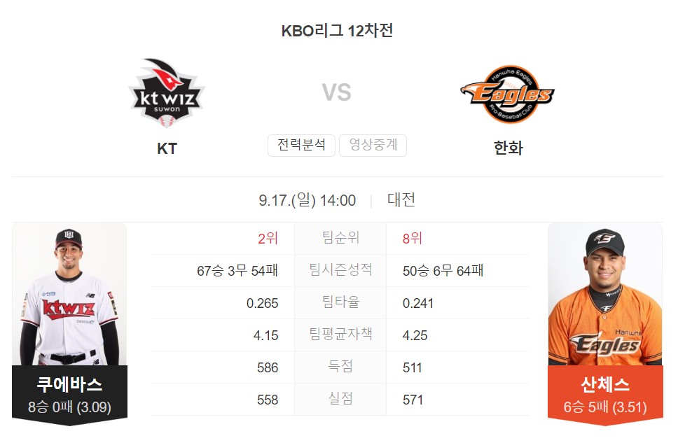 9월 16일 프로야구 KBO KT VS 한화 경기 프리뷰 (0) | 2023.09.16 |