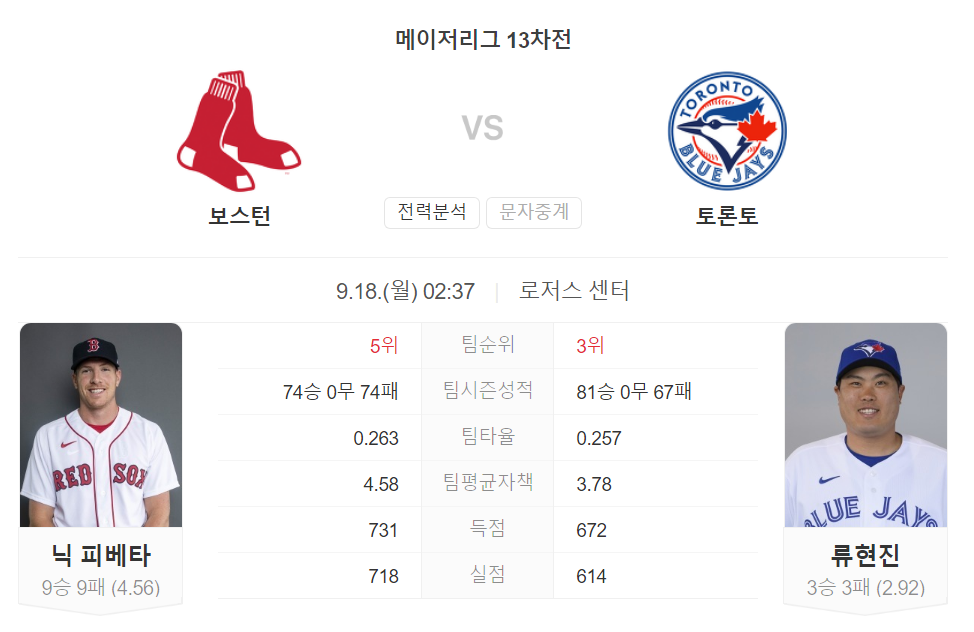 보스턴 레드삭스는 닉 피베타(9승 9패 4.56)를 선발로 투입합니다. 피베타는 최근 5.1이닝 3실점의 부진한 경기를 펼치며 선발로서의 모습이 좋지 않다는 것을 보여주고 있습니다. 피베타의 원정 경기에서의 한계도 염두에 두어야 할 것입니다. 전날 경기에서는 보스턴 타선이 단 5개의 안타로 활약이 부진했습니다.