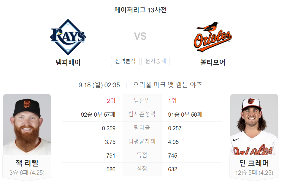 9월 18일 메이저리그 MLB 탬파베이 VS 볼티모어 경기 프리뷰
