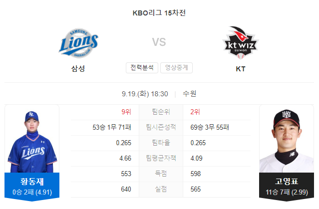 9월 19일 프로야구 KBO 삼성 VS KT 경기 프리뷰