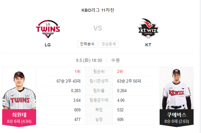 또한, LG의 선발 투수 최원태는 최근에 성적이 좋지 않았으며, KT 타자들은 그의 공을 잘 공략할 가능성이 높습니다. 한편, KT의 선발 투수 윌리엄 쿠에바스는 최근에 좋은 성적을 기록하고 있으며, 이를 토대로 KT는 안정된 투수진을 유지할 것으로 예상됩니다.