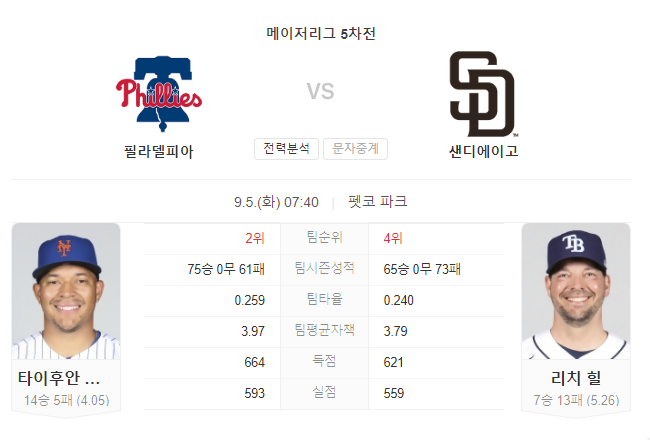 필라델피아는 현재 NL 중부 지구에서 선두를 달리고 있으며, 와일드카드 레이스에서 1위를 유지하고 있습니다. 포스트 시즌 진출이 거의 확실한 상황이며, 타이후안 워커가 선발 투수로 나설 예정입니다.