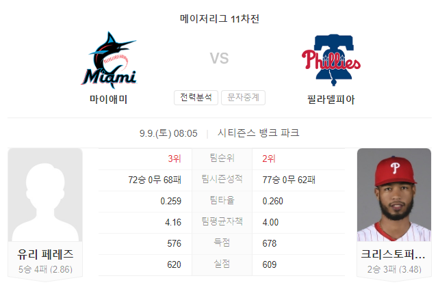 9월 9일 메이저리그는 마이애미 말린스와 필라델피아 필리스의 대결이 예정되어 있습니다. 양 팀은 각각의 선발 투수와 타선의 역할이 경기의 결과를 좌우할 것으로 예상됩니다.