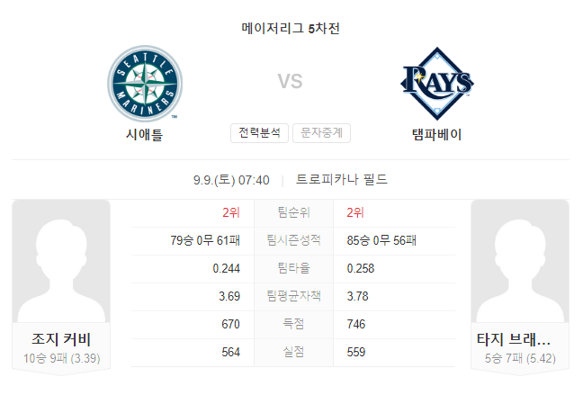 9월 9일 메이저리그는 시애틀과 탬파베이 간의 대결이 예정되어 있습니다. 양 팀은 각각의 투수와 타선의 역할이 중요한 경기를 펼칠 것으로 예상됩니다.