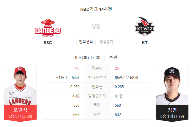 KT 위즈는 김민의 상대로 오원석(6승 8패 5.38)을 선발로 내세웁니다. 오원석은 3일 KIA와 홈 경기에서 6이닝 5실점의 부진한 투구를 보여주며 후반기 들어서도 투구가 살아나지 않고 있는 중입니다. 금년 KT 상대로 홈에서 패배한 경험이 있어 불안감을 가지고 있습니다.